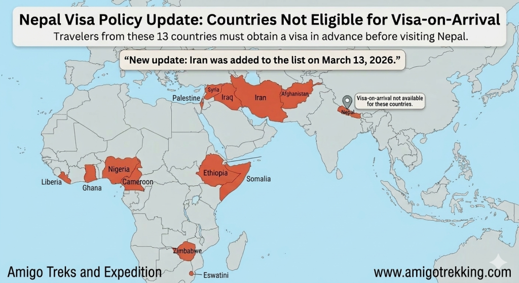 With Iran now included on the list, the total number of countries whose citizens cannot obtain visas on arrival in Nepal has reached 13. The list includes: